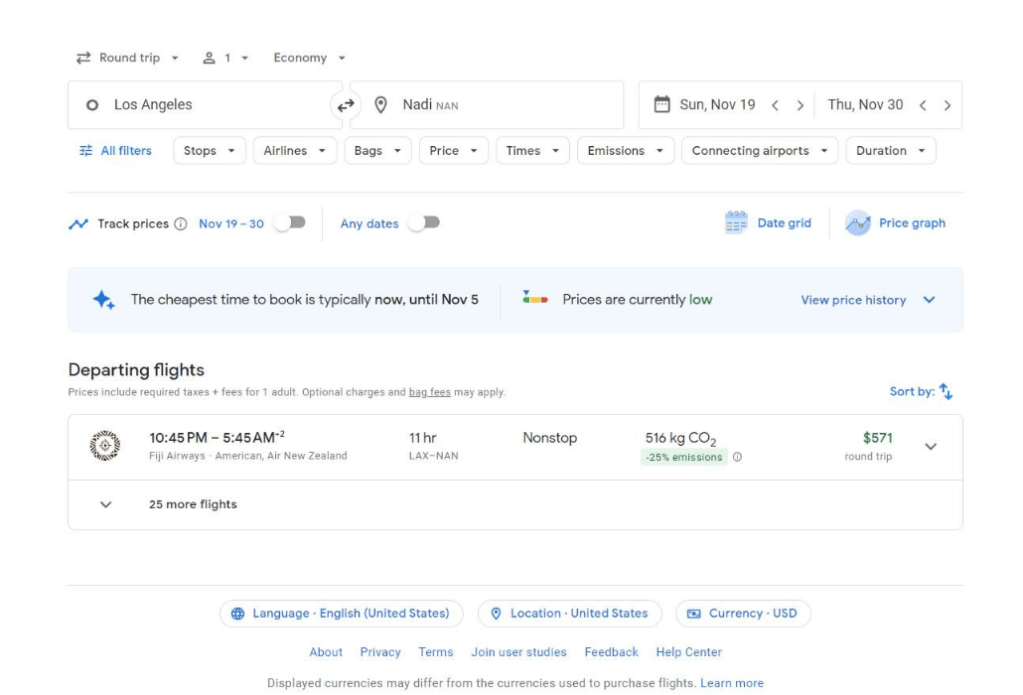 - Los Angeles International Airport (LAX) to Nadi International Airport (NAN), starting at $575.