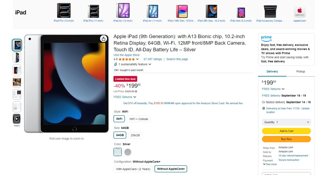 Deal #1 – Apple iPad (9th Generation): with A13 Bionic chip, 10.2-inch Retina Display, 64GB, Wi-Fi, 12MP front/8MP Back Camera, Touch ID, All-Day Battery Life – Silver 【40% off】