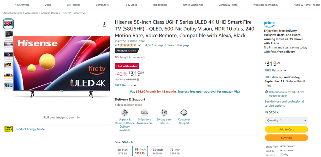 Deal #2 – Hisense 58-Inch Class U6HF Series ULED 4K UHD Smart Fire TV (75U6HF, 2024) – QLED, 600-Nit Dolby Vision, Game Mode Plus VRR, HDR 10+, 240 Motion Rate, MEMC, Voice Remote, Compatible with Alexa, Black 【Up to 42% off】