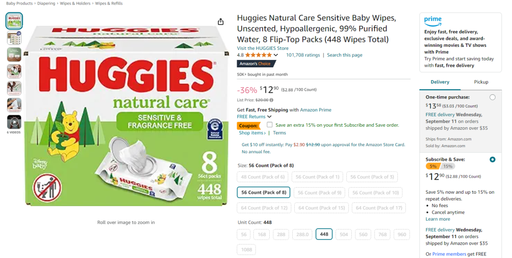 Deal #3 – Huggies Natural Care Sensitive Baby Wipes, Unscented, Hypoallergenic, 99% Purified Water, 8 Flip-Top Packs (448 Wipes Total) 【36% OFF】