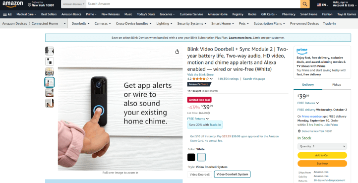 Blink Video Doorbell: This device allows you to see, hear, and speak to visitors at your door through a high-definition video feed accessible via your smartphone. It features two-way audio, motion detection, and night vision, ensuring you’re always connected, day or night.