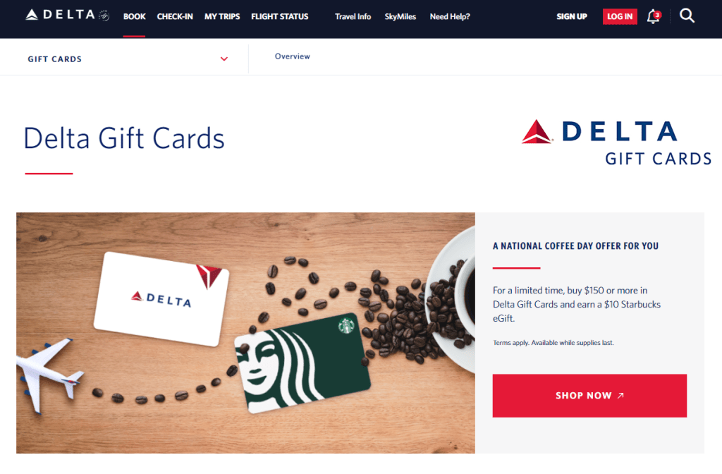 Offer: While supplies last or until 10/2/24 11:59pm EST, purchase USD $150 or more in Delta Gift Cards by going to http://promo.giftcards.delta.com (the “Promotional website”) starting 9/27/24 and receive a $10 Starbucks eGift with your qualifying Delta Gift Card purchase. Eligible customers will earn one bonus $10 Starbucks eGift per purchase of Delta Gift Cards at $150 or more. The customer will automatically be opted in to the promotion if shopping on the Promotional website. Bonus Starbucks eGift will be emailed to eligible purchaser separately from the Delta Gift Card, to purchaser’s email address listed at time of purchase. Starbucks eGift can be used multiple times, up to the value of $10.