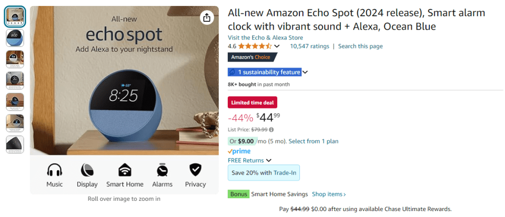 Introducing the all-new Amazon Echo Spot (2024 release) in a stunning Ocean Blue finish! This smart alarm clock not only features a vibrant display but also delivers rich sound, making it the perfect addition to your bedside. With Alexa built-in, you can easily set alarms, check the weather, play your favorite music, and control your smart home devices—all with just your voice. The Echo Spot’s sleek design fits seamlessly into any decor, while its intuitive interface allows for effortless navigation. Wake up to your favorite tunes or soothing sounds, and start your day with the power of Alexa right at your side. Experience a new way to rise and shine with the Echo Spot!