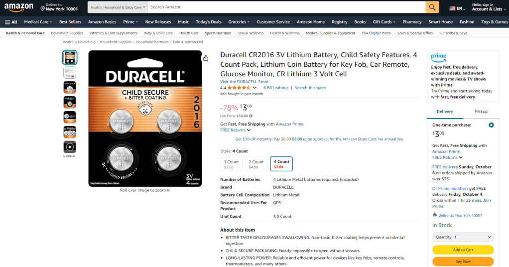 Duracell Lithium Coin batteries provide reliable, long-lasting power for medical devices, electronics, security systems, and more. Guaranteed to last up to 10 years in storage, you can trust they’ll be ready when you need them. Duracell’s 20mm lithium coin batteries offer enhanced child safety features compared to other leading brands, including an innovative, non-toxic bitter coating to help prevent accidental swallowing. The child-secure packaging is designed to be nearly impossible to open by hand. Whether for emergencies, medical devices, or holiday gadgets, Duracell is the #1 trusted battery brand.