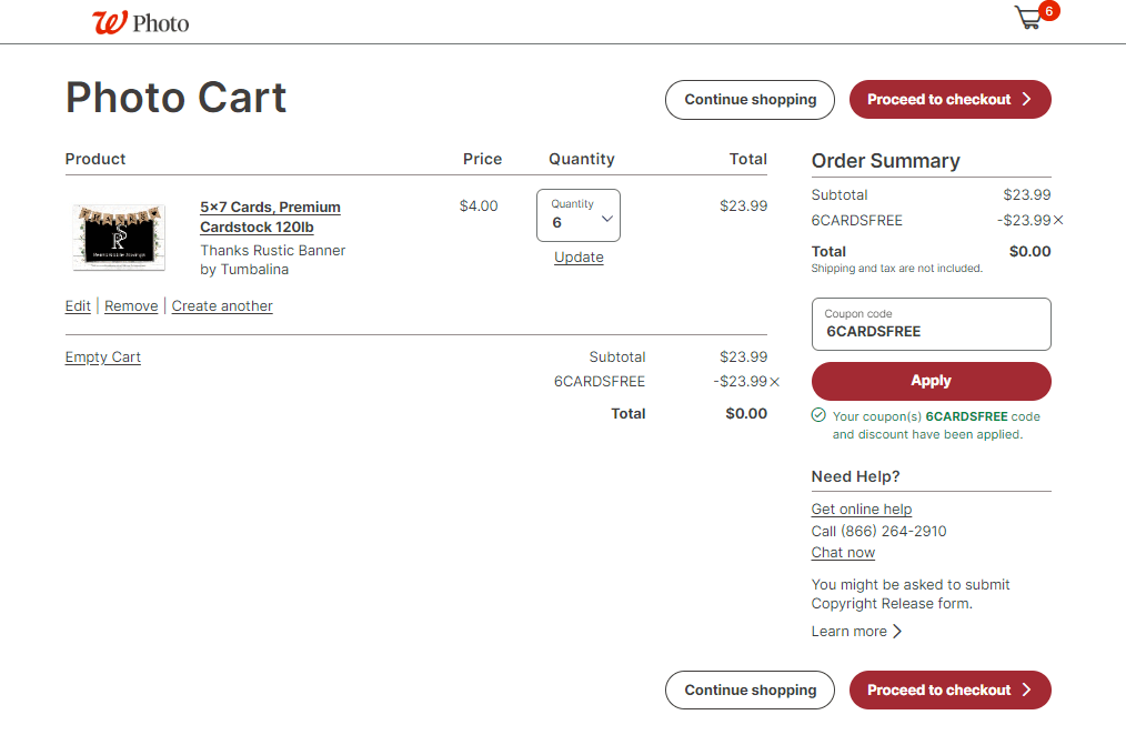 Step 5: Enter the promo code “6CARDSFREE” and then proceed to checkout
