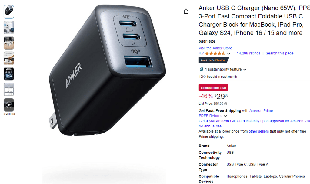 1. Anker USB C Charger(Nano II 65W), PPS 3-Port Fast Compact Foldable Wall Charger for MacBook Pro/Air, iPad Pro, Galaxy S20, Dell XPS 13, Note 20/10+, iPhone 16 / 16 Pro, Steam Deck, and More