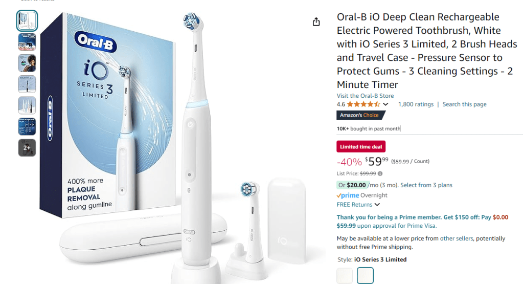 4. Oral-B iO Deep Clean Rechargeable Electric Powered Toothbrush, White with iO Series 3 Limited, 2 Brush Heads and Travel Case – Pressure Sensor to Protect Gums – 3 Cleaning Settings – 2 Minute Timer