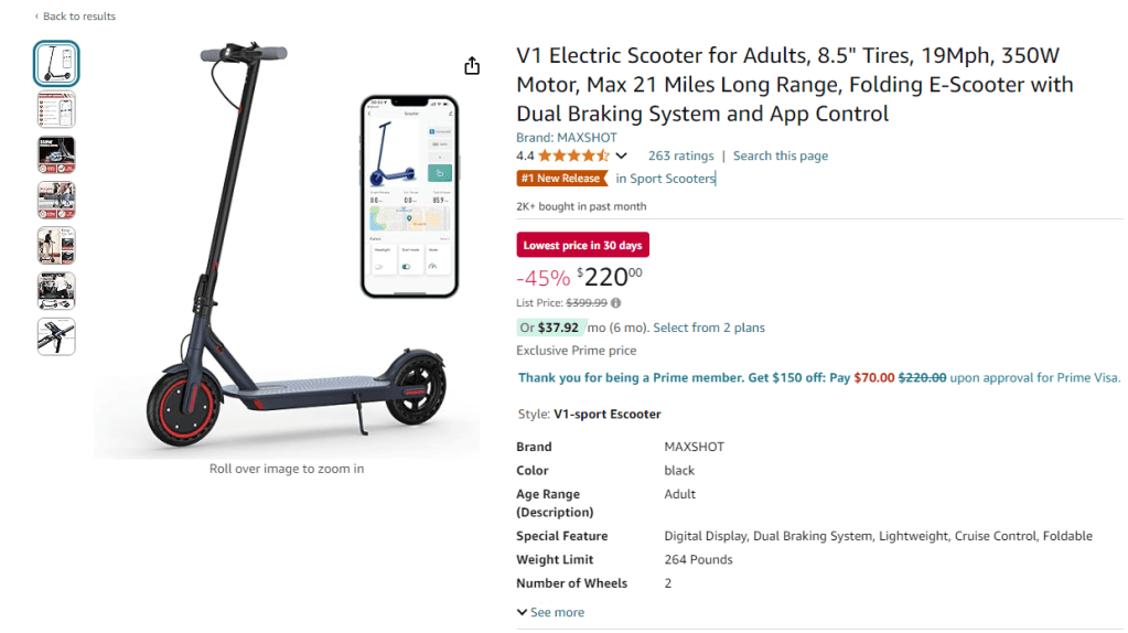 1. V1 Electric Scooter for Adults, 8.5″ Tires, 19Mph, 350W Motor, Max 21 Miles Long Range, Folding E-Scooter with Dual Braking System and App Control