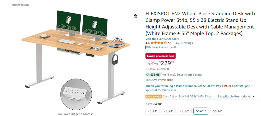 2. FLEXISPOT EN2 Whole-Piece Standing Desk with Clamp Power Strip, 55 x 28 Electric Stand Up Height Adjustable Desk with Cable Management (White Frame + 55″ Maple Top, 2 Packages)