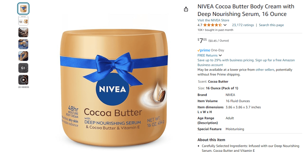 3. NIVEA Cocoa Butter Body Cream with Deep Nourishing Serum, 16 Ounce