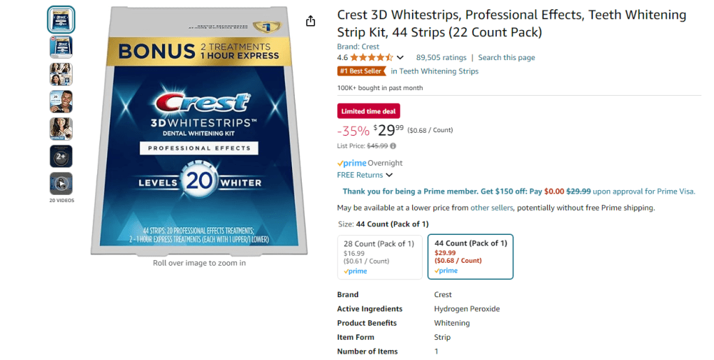 2. Crest 3D Whitestrips, Professional Effects, Teeth Whitening Strip Kit, 44 Strips (22 Count Pack)
