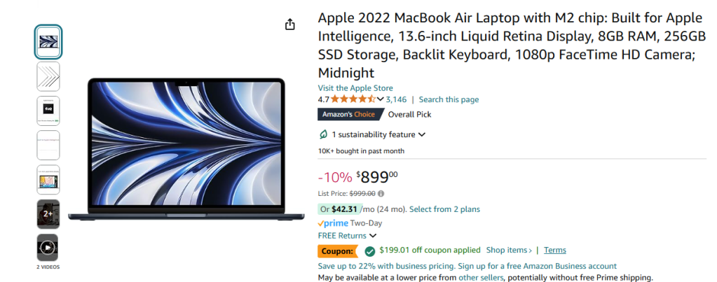1. Apple 2022 MacBook Air Laptop with M2 chip: Built for Apple Intelligence, 13.6-inch Liquid Retina Display, 8GB RAM, 256GB SSD Storage, Backlit Keyboard, 1080p FaceTime HD Camera; Midnight