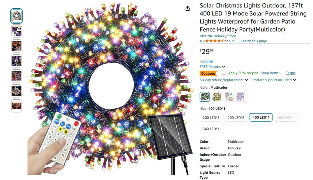 4. Solar Christmas Lights Outdoor, 137ft 400 LED 19 Mode Solar Powered String Lights Waterproof for Garden Patio Fence Holiday Party(Multicolor)