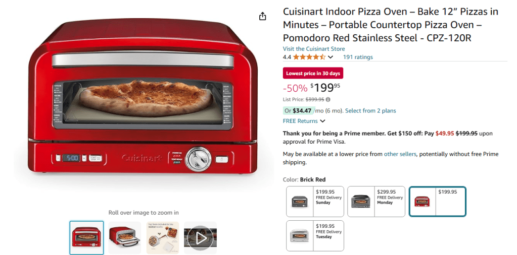 2. Cuisinart Indoor Pizza Oven – Bake 12” Pizzas in Minutes – Portable Countertop Pizza Oven – Pomodoro Red Stainless Steel – CPZ-120R