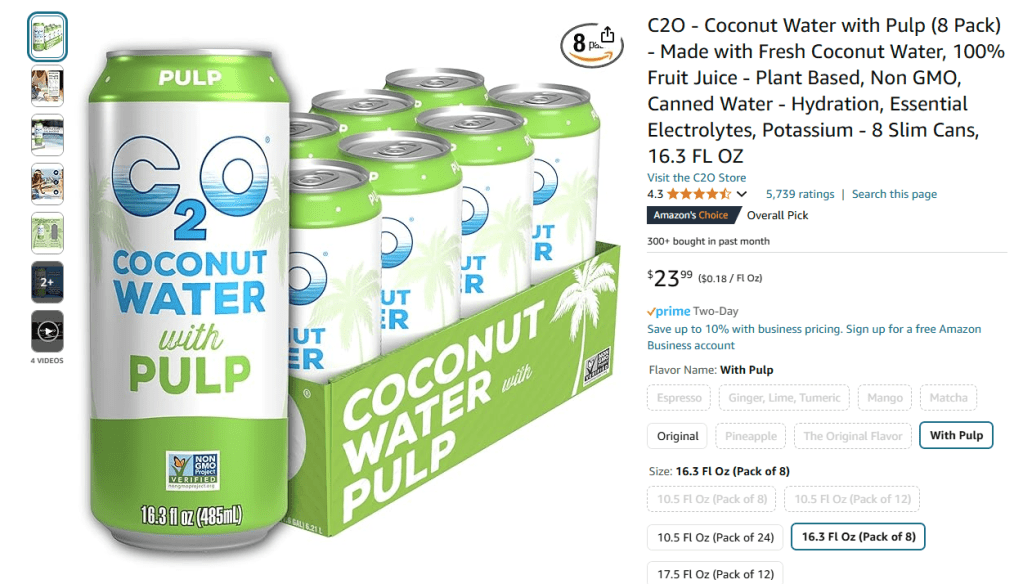 3. C2O – Coconut Water with Pulp (8 Pack) – Made with Fresh Coconut Water, 100% Fruit Juice – Plant Based, Non GMO, Canned Water – Hydration, Essential Electrolytes, Potassium – 8 Slim Cans, 16.3 FL OZ