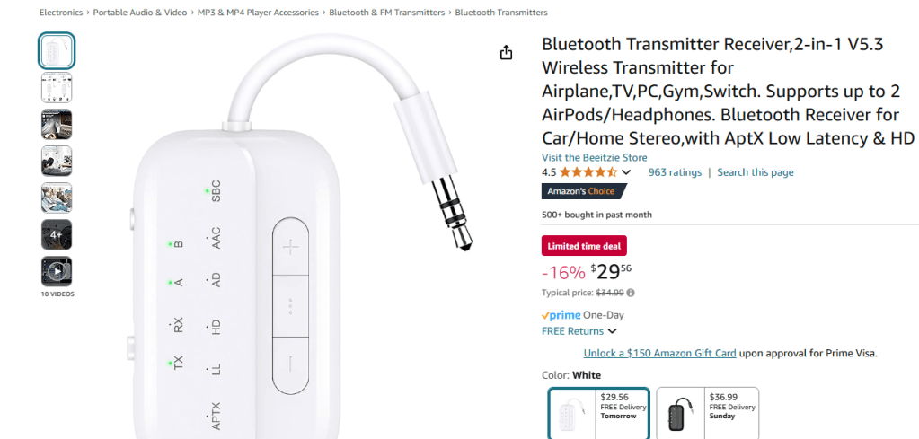 4. Bluetooth Transmitter Receiver,2-in-1 V5.3 Wireless Transmitter for Airplane,TV,PC,Gym,Switch. Supports up to 2 AirPods/Headphones. Bluetooth Receiver for Car/Home Stereo,with AptX Low Latency & HD