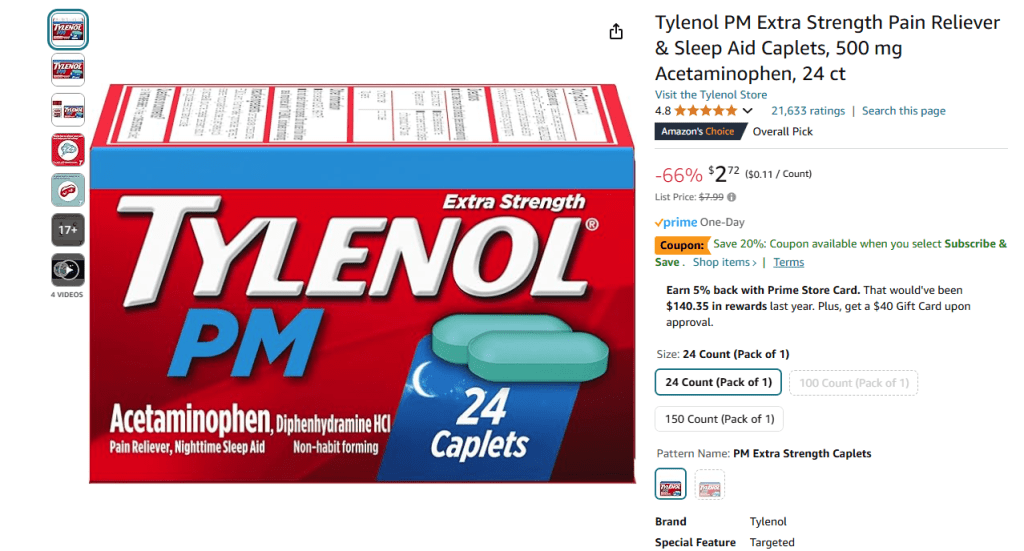 2. Tylenol PM Extra Strength Pain Reliever & Sleep Aid Caplets, 500 mg Acetaminophen, 24 ct