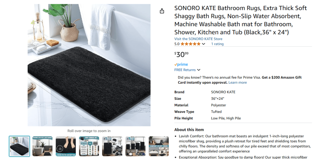 3. SONORO KATE Bathroom Rugs, Extra Thick Soft Shaggy Bath Rugs, Non-Slip Water Absorbent, Machine Washable Bath mat for Bathroom, Shower, Kitchen and Tub (Black,36″ x 24″)