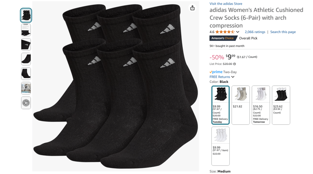 4. adidas Women’s Athletic Cushioned Crew Socks (6-Pair) with arch compression