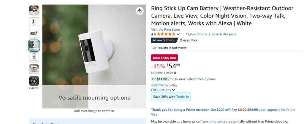 4. Ring Stick Up Cam Battery | Weather-Resistant Outdoor Camera, Live View, Color Night Vision, Two-way Talk, Motion alerts, Works with Alexa | White